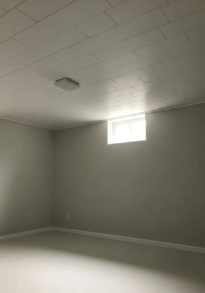 This open basement room is painted in a soft greige that balances warmth and brightness. The shade helps reflect light from the window while keeping the room from feeling stark. It feels like a flexible space ready for anything.