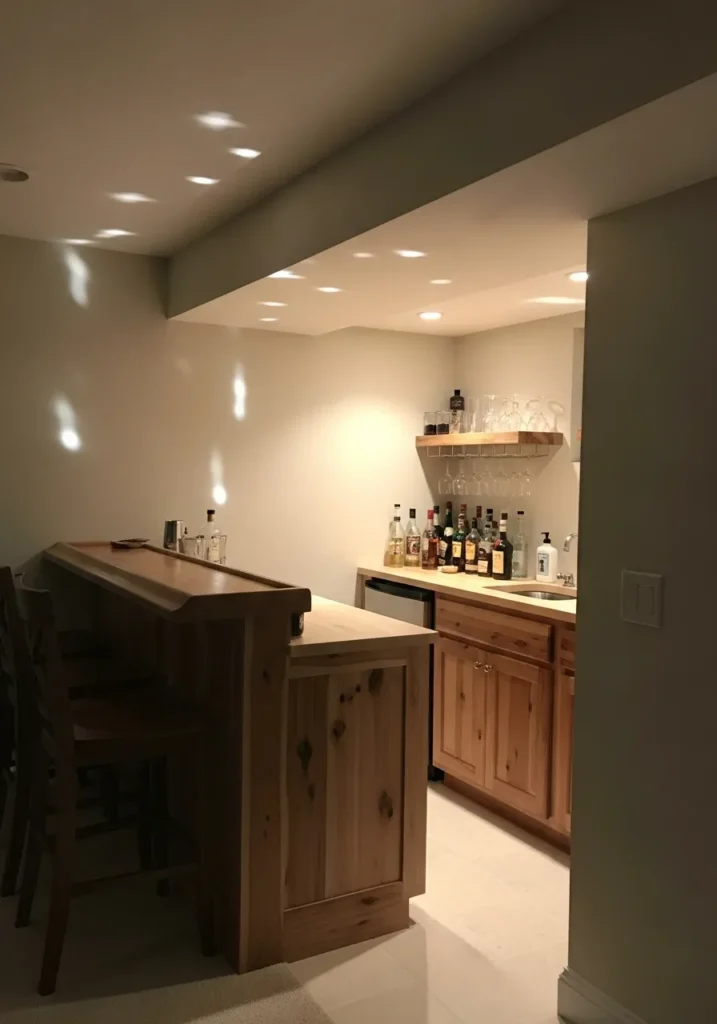 This basement bar area uses a light warm white paint color that reflects light beautifully. The shade keeps the space feeling open while allowing wood cabinetry to stand out. The overall look feels clean and welcoming.