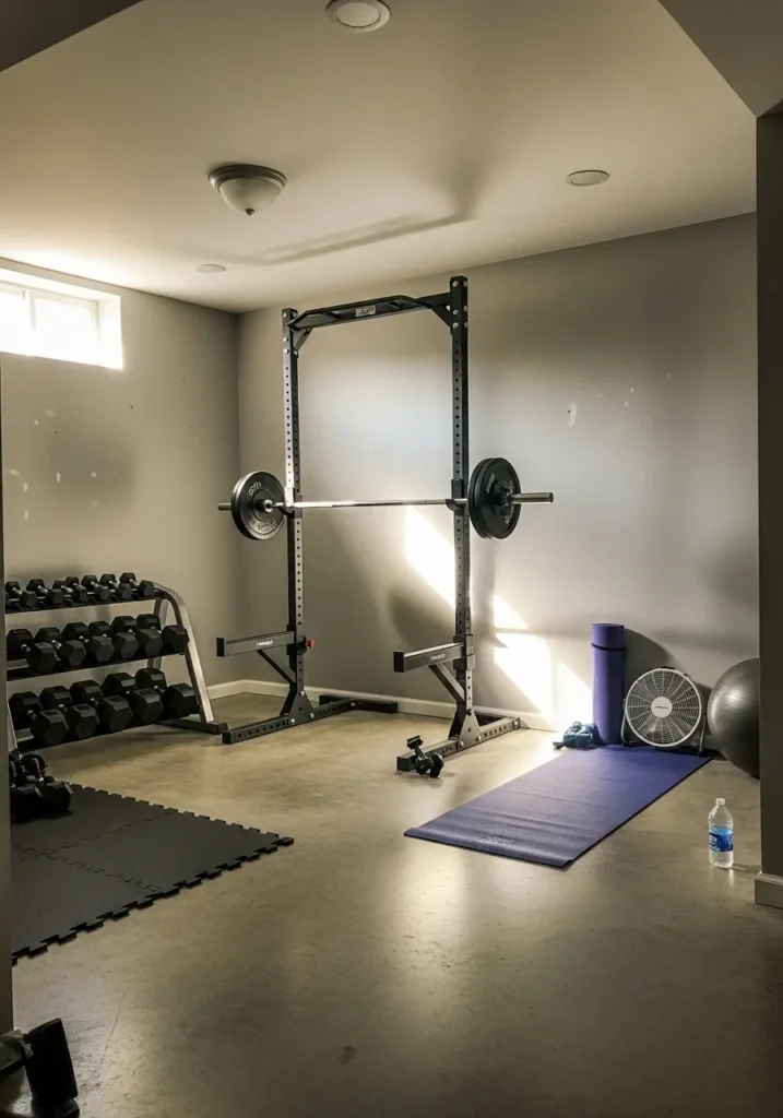 The walls in this basement gym are painted in a warm gray that reflects light evenly and keeps the room from feeling stark. The tone works well with rubber flooring and equipment while still feeling inviting. The overall look feels practical but comfortable.