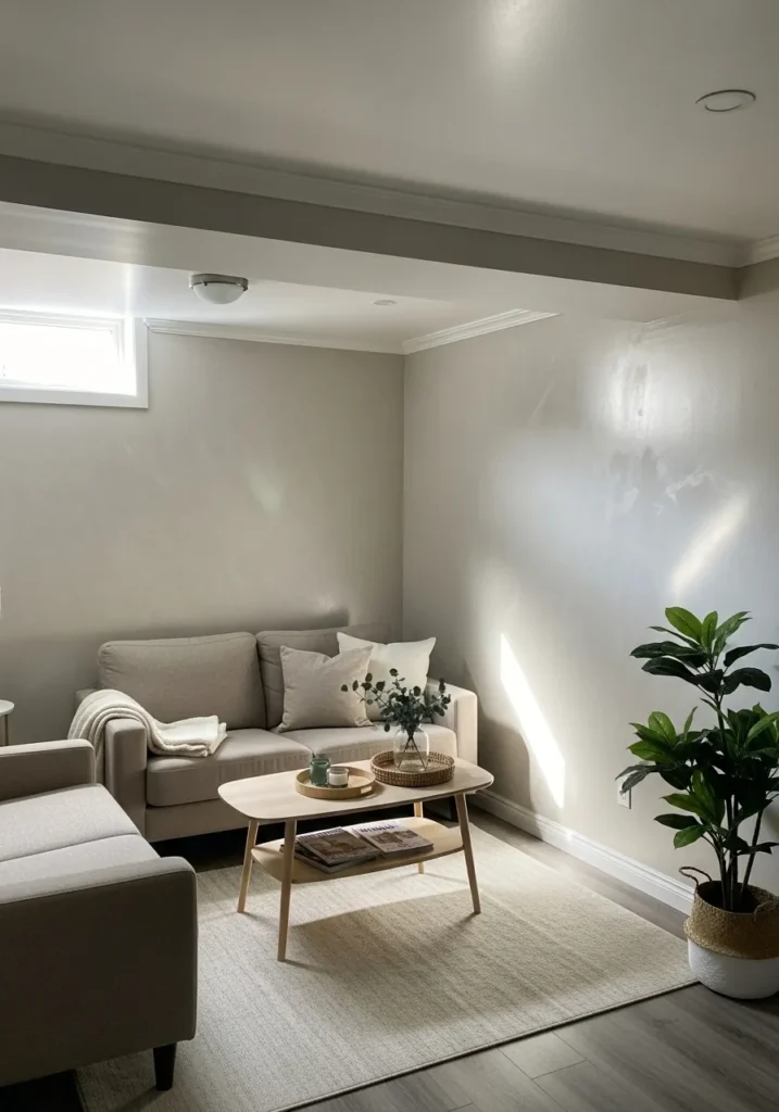 This basement living room is painted in a soft ivory shade that reflects light beautifully across the space. The color keeps the room feeling open and airy, even with exposed ceiling details. Light furniture and simple decor blend seamlessly with the walls for a calm and cohesive look.