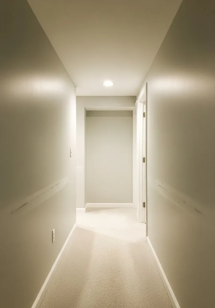 This hallway is painted in a soft pearl tone that helps bounce light down the length of the space. The walls glow gently under ceiling lights, keeping the hallway from feeling narrow or dark. The finish feels smooth and calm.