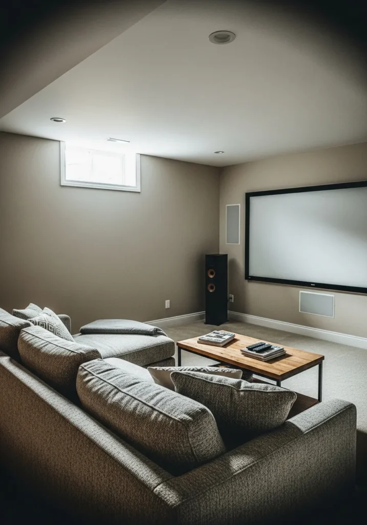 This basement media room uses a warm greige paint color that helps the space feel brighter and more inviting. The shade works beautifully with wood floors and soft seating. Even with limited daylight, the room feels comfortable.