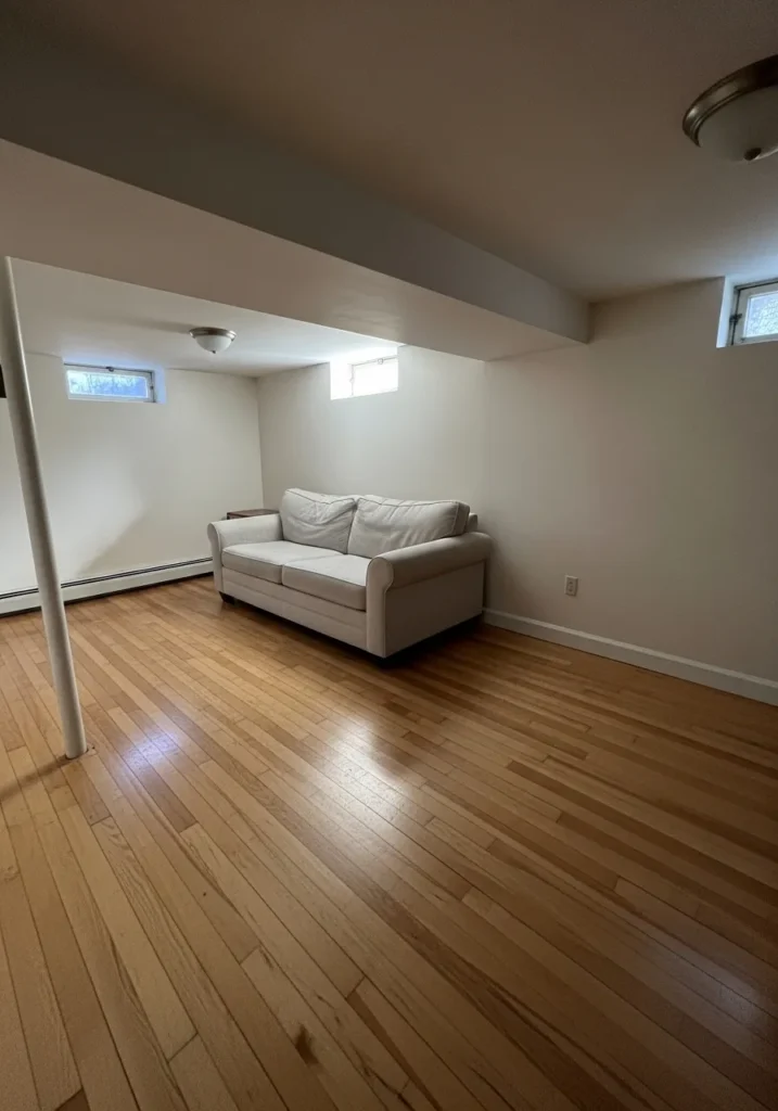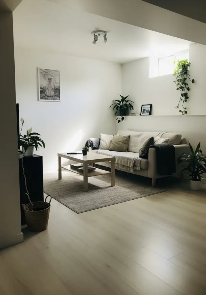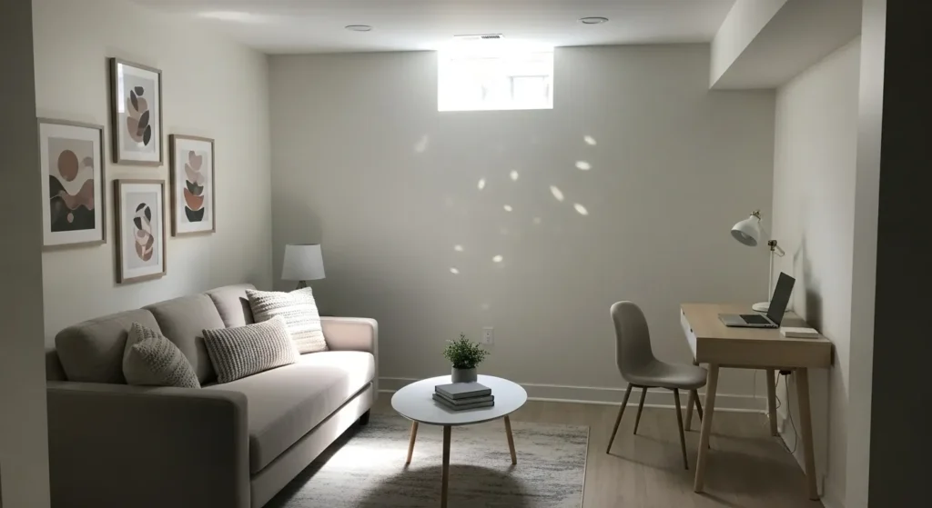 This basement living room is painted in a soft white that keeps the space feeling bright and open. The walls reflect both ceiling light and the small window light gently, which helps the room feel airy instead of closed in. Light flooring and simple furniture work beautifully with the paint to create a clean and relaxed look.