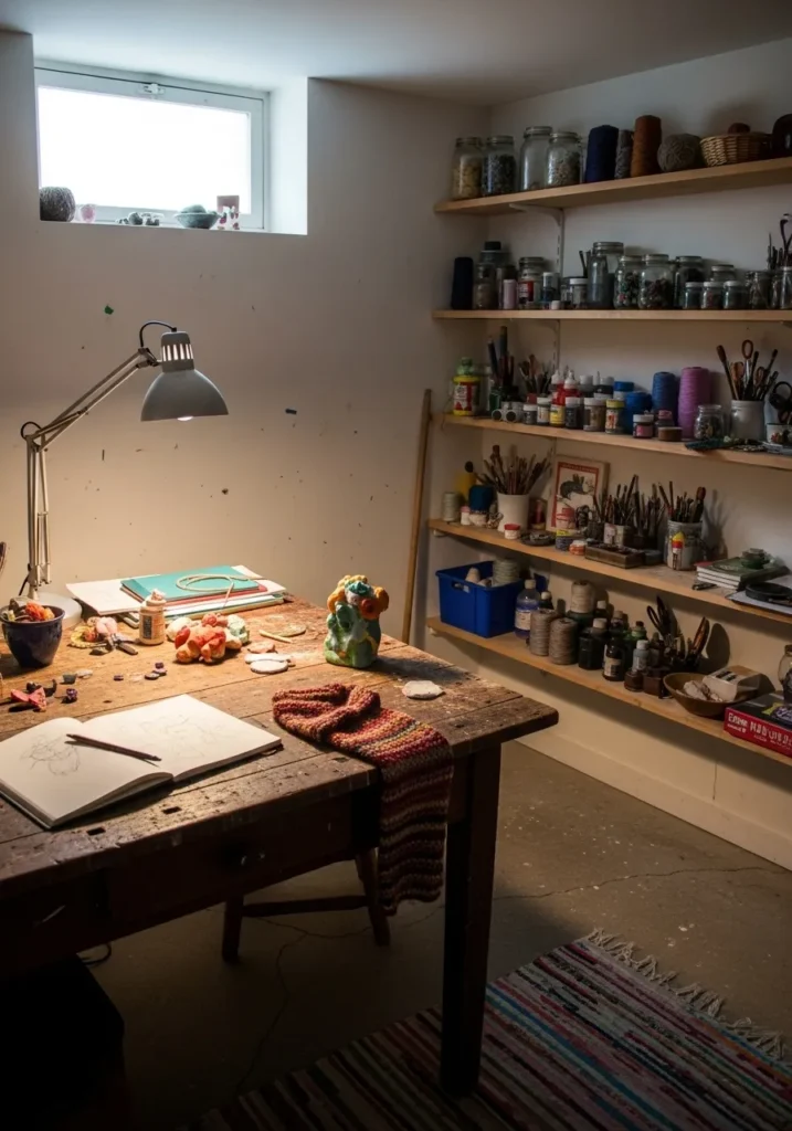 This basement creative studio features soft white walls that brighten the workspace without distraction. Shelving and supplies stand out clearly against the clean backdrop. Light from the small window spreads gently and keeps the room feeling open and functional.