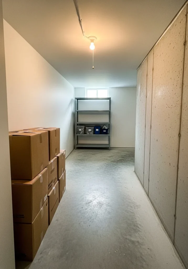 This basement storage hallway is painted in a clean soft white that keeps the long space feeling bright and manageable. The walls reflect overhead lighting evenly and prevent the corridor from feeling tight or gloomy. Boxes and storage feel organized rather than overwhelming.