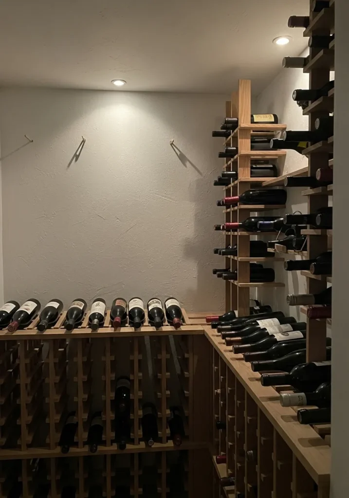This basement wine storage area features soft white walls that keep the space feeling fresh and orderly. The color reflects light gently and highlights the storage racks without drawing attention away from them. Everything feels balanced and calm.