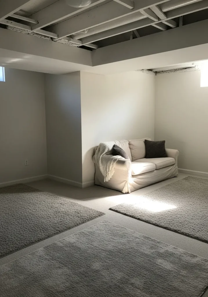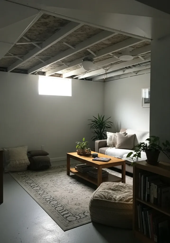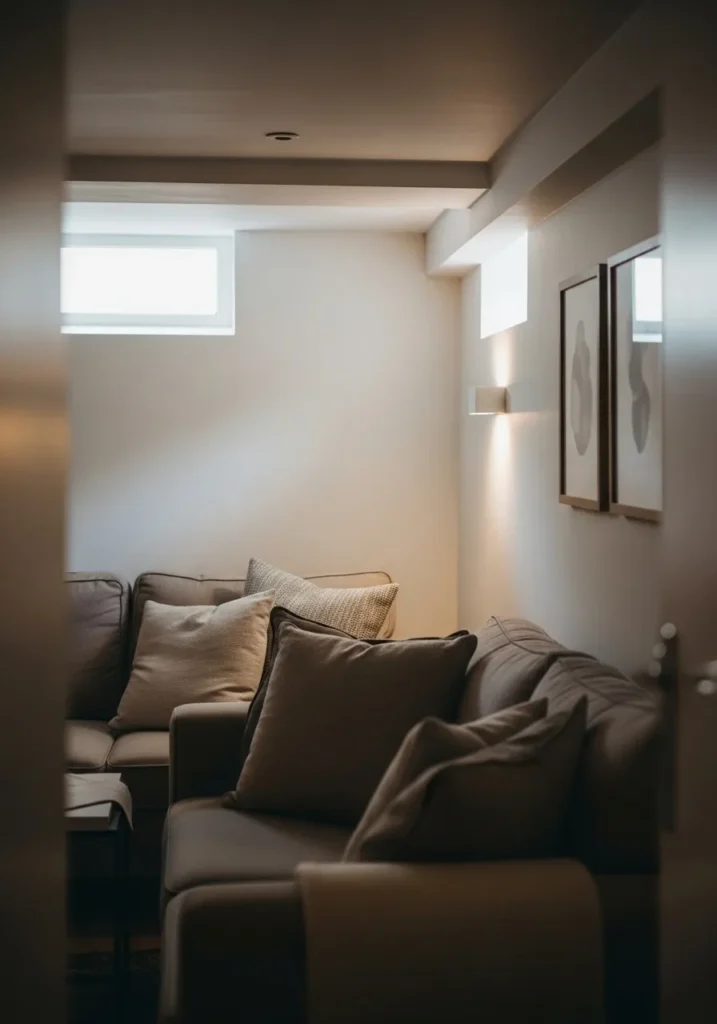 Soft White Basement Seating Area With Gentle Light