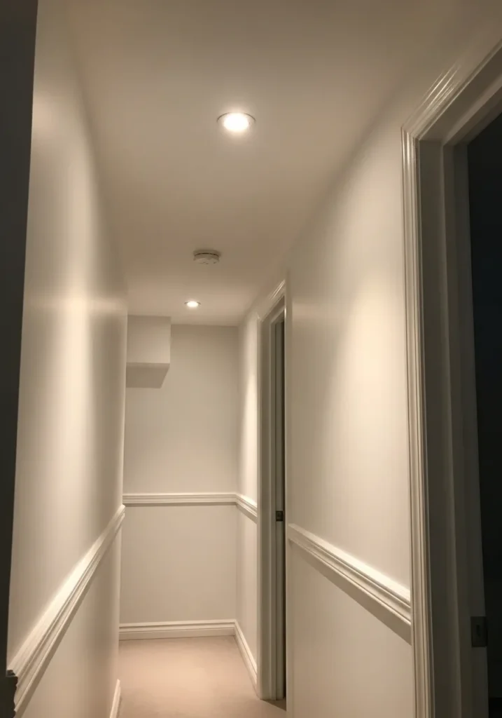 This basement hallway is painted in a soft white that keeps the narrow space feeling bright and uncluttered. The walls reflect ceiling light evenly and help the hallway feel longer and more open. Simple trim and smooth finishes let the color shine without distraction.