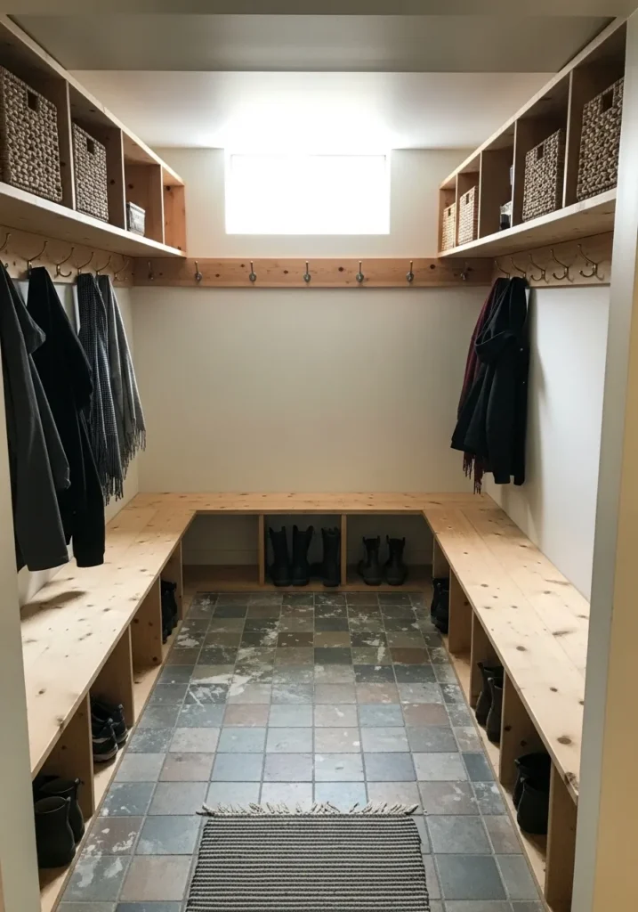 I really like how elevated this feels for a basement closet. The soft white makes everything look neat and intentional. It feels more like a boutique space than storage.
