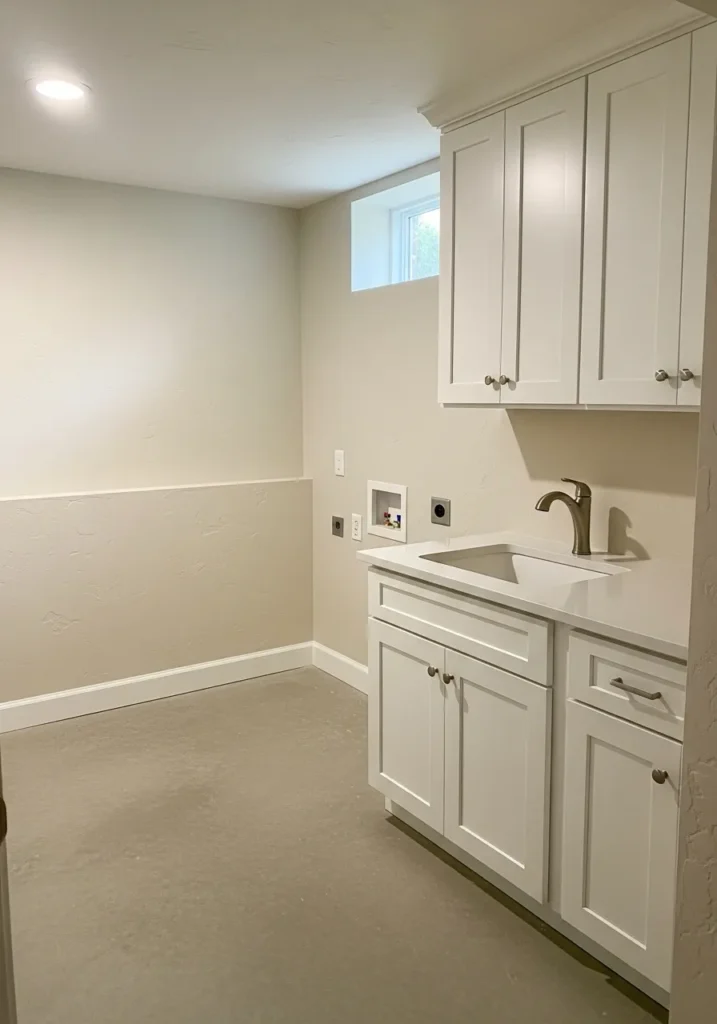 This basement utility area uses a clean soft white that makes the cabinetry feel crisp and uncluttered. The walls bounce light gently and keep the room from feeling narrow or overly functional. Everything feels tidy and well cared for.