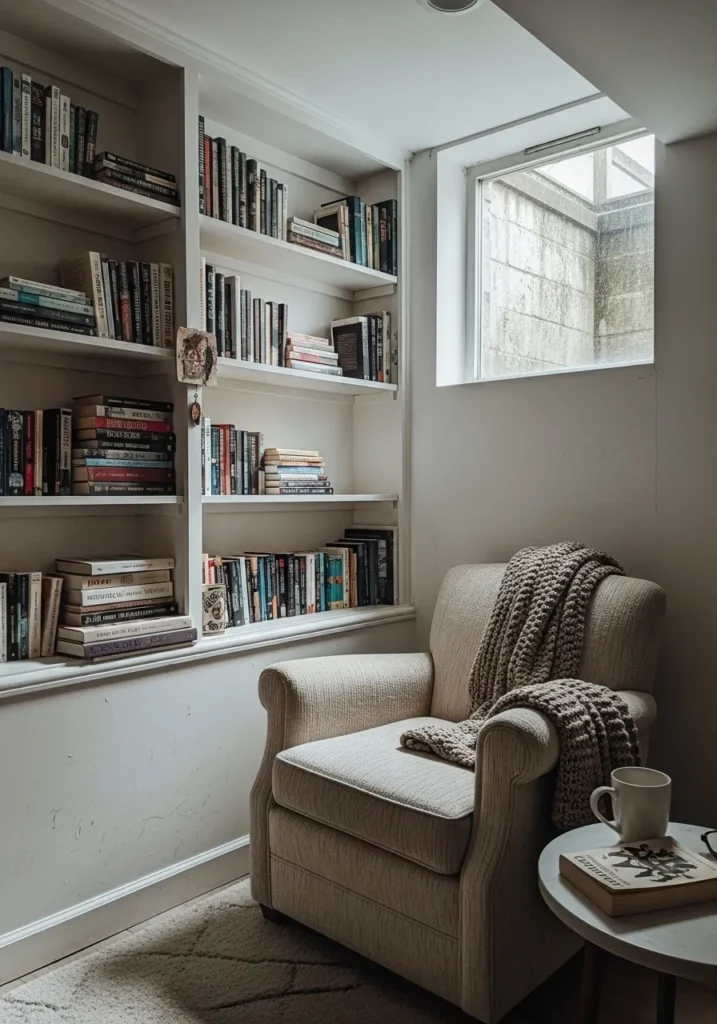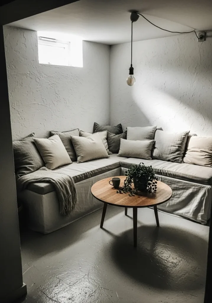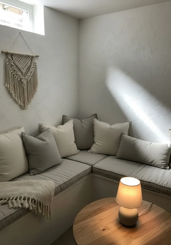 This cozy basement nook features soft white walls that reflect lamp light gently. The color keeps the corner feeling airy while still warm and inviting. Textured pillows and soft seating blend beautifully into the light palette.
