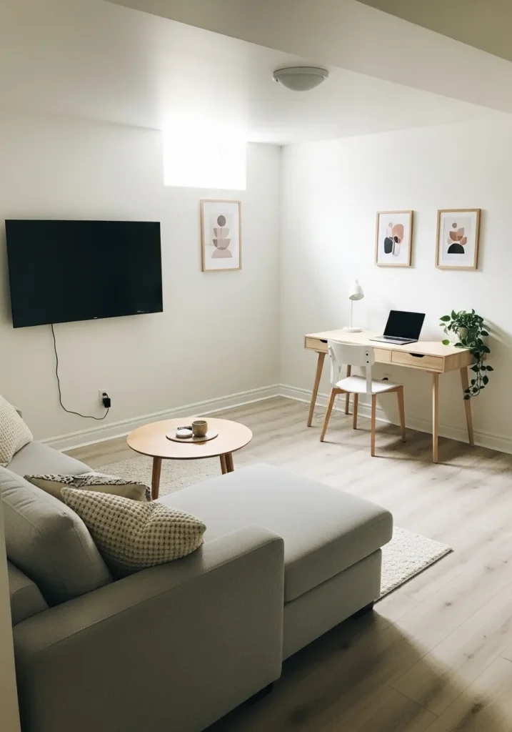 This basement seating area is painted in soft white that keeps the narrow space feeling open. The walls reflect light gently and help the furniture feel lighter. The overall look is calm and uncluttered.