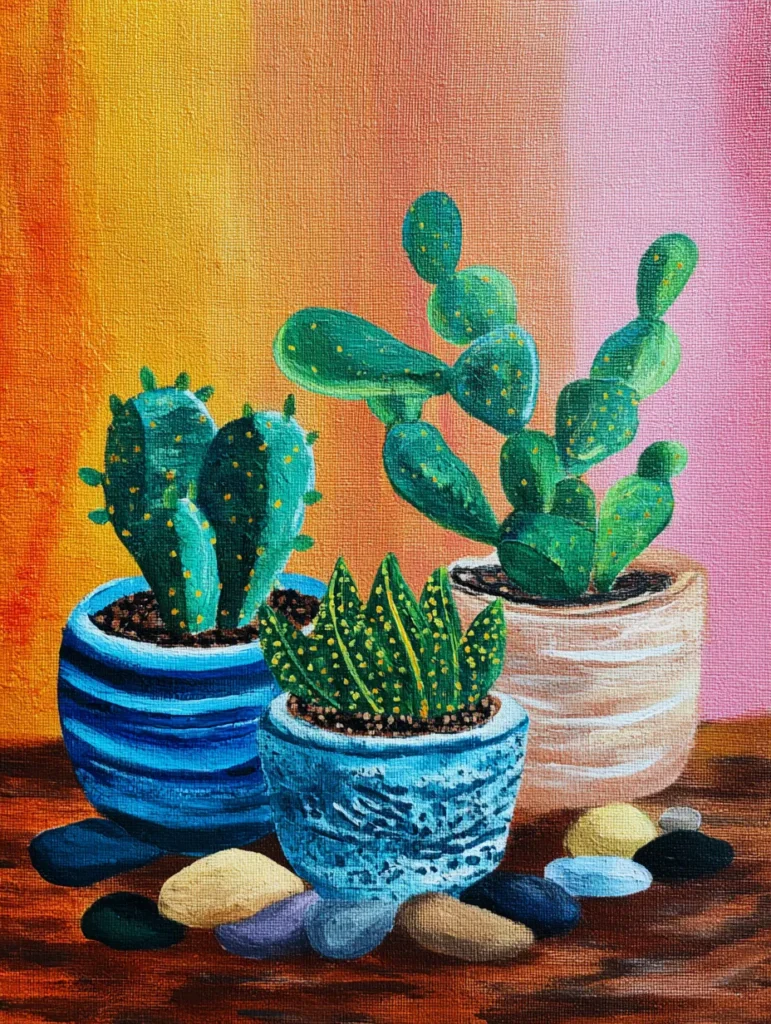 This painting features three distinct cacti potted in unique containers set against a warm, gradient background that shifts from deep orange to soft pink. The cacti display various shades of green with subtle yellow dots representing needles, while the pots boast textures ranging from smooth blue stripes to a rustic beige clay look. A collection of smooth, colorful pebbles rests on a dark wooden surface in the foreground to ground the composition. You can achieve this look by first blending your background colors while the paint is still wet to get that seamless transition. Paint your pots and cacti using flat brushes for the main shapes and a small liner brush for those tiny needle details, making sure to let each layer dry before adding highlights to give them a rounded appearance.