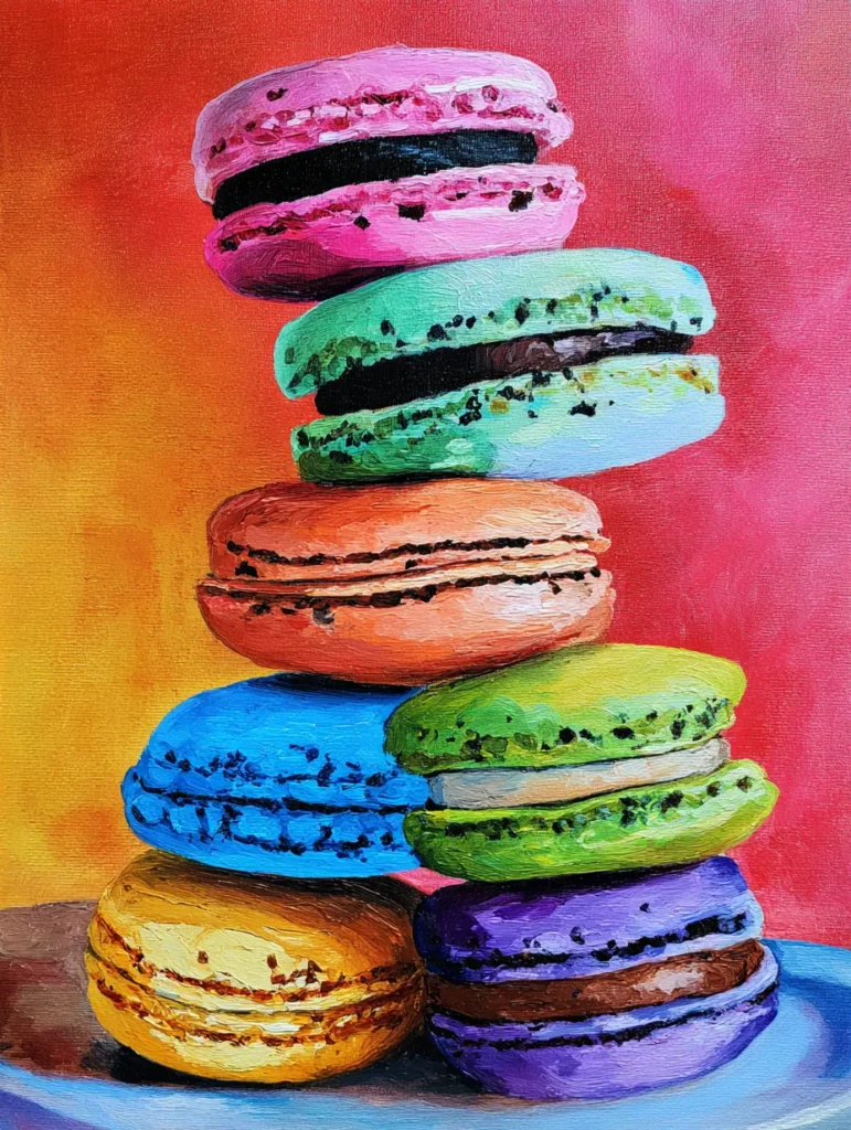 This sweet painting features a tall, precarious stack of French macarons in a rainbow of bright colors, including hot pink, mint green, sunshine yellow, and deep purple. Each cookie is rendered with a thick, textured impasto style that highlights the characteristic ruffled edges and creamy fillings, all set against a warm, blended gradient background that shifts from orange to vibrant rose. To bring this treat to life, start by painting your background with smooth, long strokes to set the tone. Next, map out the oval shapes of your macarons and use a small brush to apply paint in dabs, focusing on the texture of the cookies rather than blending it flat, and finish by adding tiny, darker dots along the edges to suggest the delicate, porous nature of the shells.