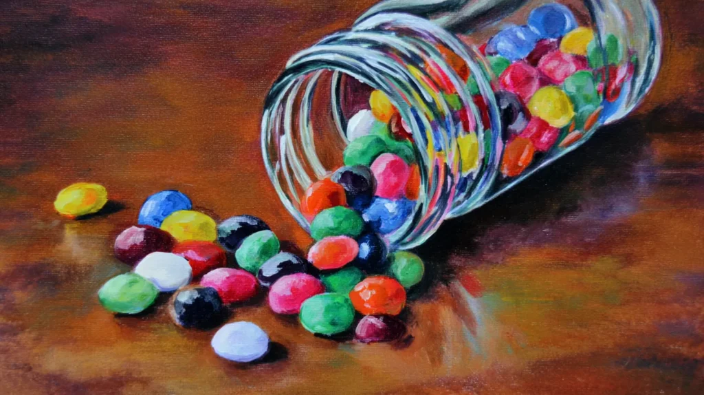 This playful painting showcases a glass jar tipped over on a light wooden surface, with a colorful trail of vibrant jelly beans spilling out. The jar is rendered with clever blue and white highlights to mimic transparent glass, while the beans themselves are bright, shiny, and packed with saturated, punchy colors. You can create this look by first painting the wooden table with soft, muted browns and then layering on the jelly beans as small, rounded shapes using thick, opaque paint. Once your base colors are down, use a tiny brush to add crisp white highlights to each bean and the jar rim, as these little dots of light are what make everything pop and look truly glossy.
