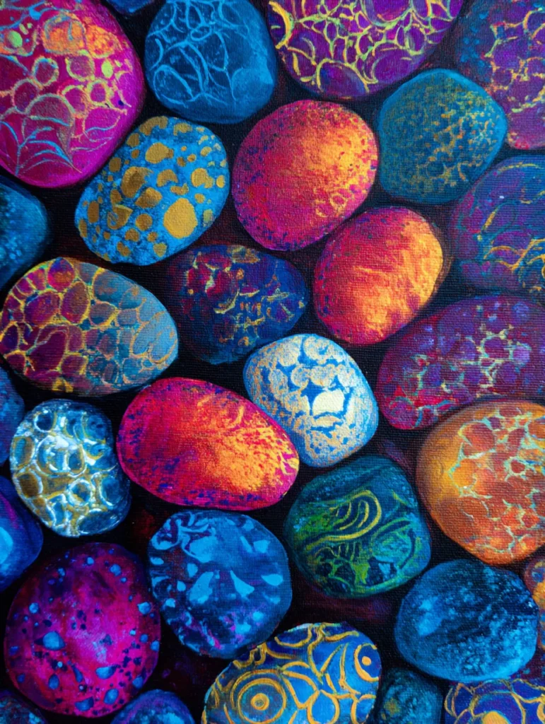 This mesmerizing design showcases a dense arrangement of smooth river stones, each decorated with intricate, glowing patterns in vibrant neon colors like hot pink, electric blue, and sunset orange. The stones are set against a deep, dark background that makes the patterns pop, featuring everything from delicate gold webs and speckles to swirling lines and geometric shapes. To create this piece, start by painting your background black and outlining your stone shapes. Fill each stone with a solid base color first, then use a very fine liner brush to layer on your patterns, adding small dots of lighter paint along the edges of the stones to give them a rounded, dimensional look that stands out from the shadows.
