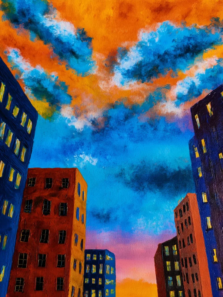 This striking piece captures a bustling city skyline bathed in the glow of a dramatic sunset sky. The clouds are a wild mix of electric orange and deep blue, creating a high-contrast backdrop for the tall, blocky buildings painted in shades of dark navy and rust red. Each building features simple vertical lines for windows with tiny touches of yellow paint to suggest glowing interior lights, giving the entire scene a lively yet cozy atmosphere. To create this, start by painting the sky with loose, expressive strokes to blend those intense orange and blue tones together. Once the background is dry, block in your buildings with flat, bold colors and finish by using a thin liner brush to add those small, warm yellow squares that bring the city to life.