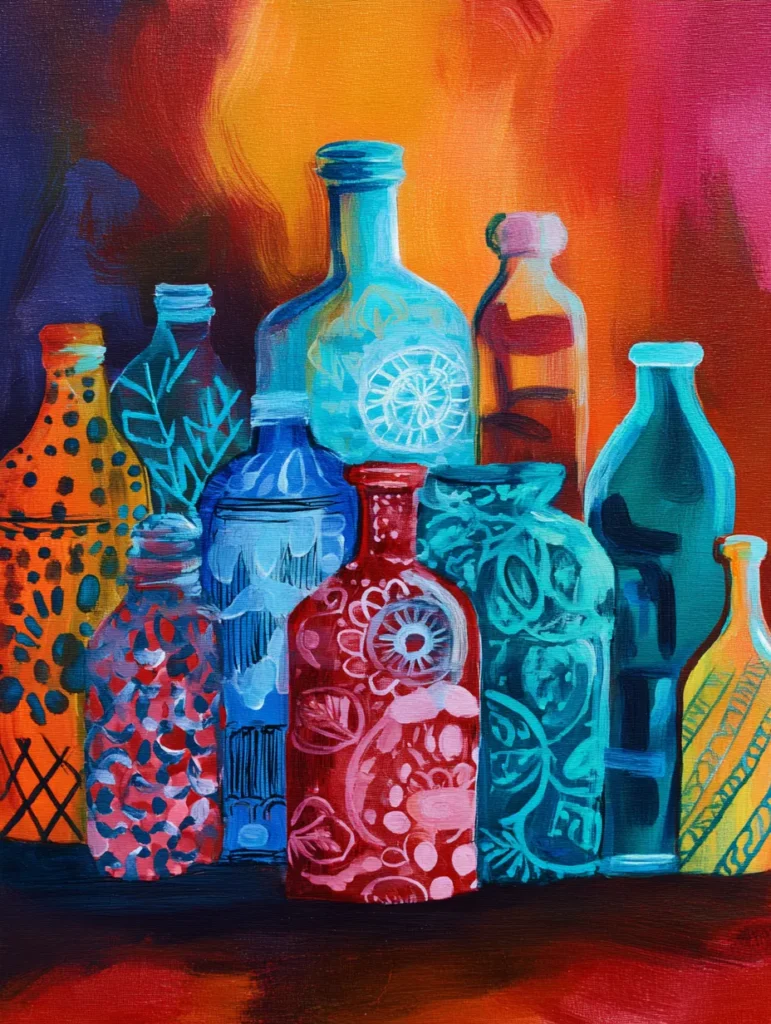 This vibrant painting features an eclectic row of glass bottles standing against a warm, fiery background of red and orange hues. Each bottle displays a unique personality, with different shades ranging from bright turquoise and deep blue to sunny yellow and rich red, all decorated with intricate patterns like floral motifs, polka dots, and delicate line work. You can create this look by first blocking out the silhouette of each bottle with solid, flat colors, making sure to vary their heights and shapes for visual interest. Once those base layers dry, use a fine-tipped brush to paint the various patterns onto the bottles, and finish with a thin, light-colored stroke along the edge of each bottle to mimic the reflective quality of glass.