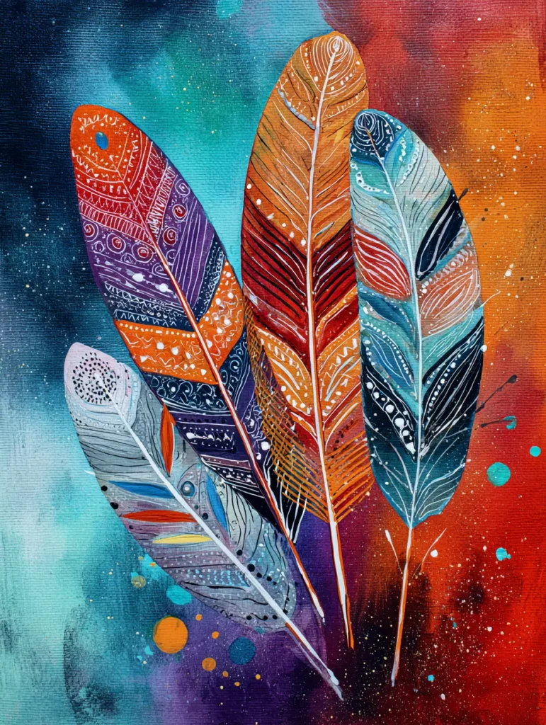 This stunning painting features a quartet of large, stylized feathers arranged in a fan shape against a dramatic, atmospheric background that transitions from deep teal to warm, fiery orange. Each feather is a canvas of its own, boasting intricate patterns like delicate dots, swirling lines, geometric zigzags, and soft stripes in a rich mix of earthy and vibrant tones. To recreate this, start by blending your background colors while they are still wet to achieve that smooth, glowing transition. Once the background is dry, sketch the simple shapes of your four feathers and paint them in solid base colors, then use a very fine liner brush to layer on the intricate details and patterns, finishing with a few splatters of white and orange paint to give the whole piece a magical, speckled effect.
