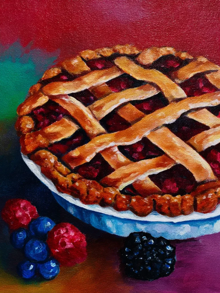 This tempting painting features a freshly baked berry pie with a golden-brown lattice crust resting on a simple plate, surrounded by a few stray raspberries, blueberries, and a blackberry. The background is a rich, warm crimson that highlights the pie’s deep, jammy berry filling. To create this, start by blocking out the round shape of the pie and the lattice strips using light tan and brown tones, then layer in your dark, vibrant berry colors inside the gaps. Use a small, firm brush to build up the texture of the crust with short, varied strokes of beige, gold, and light brown, making sure to add little dabs of white highlight to the edges of the fruit for that fresh, glossy look.