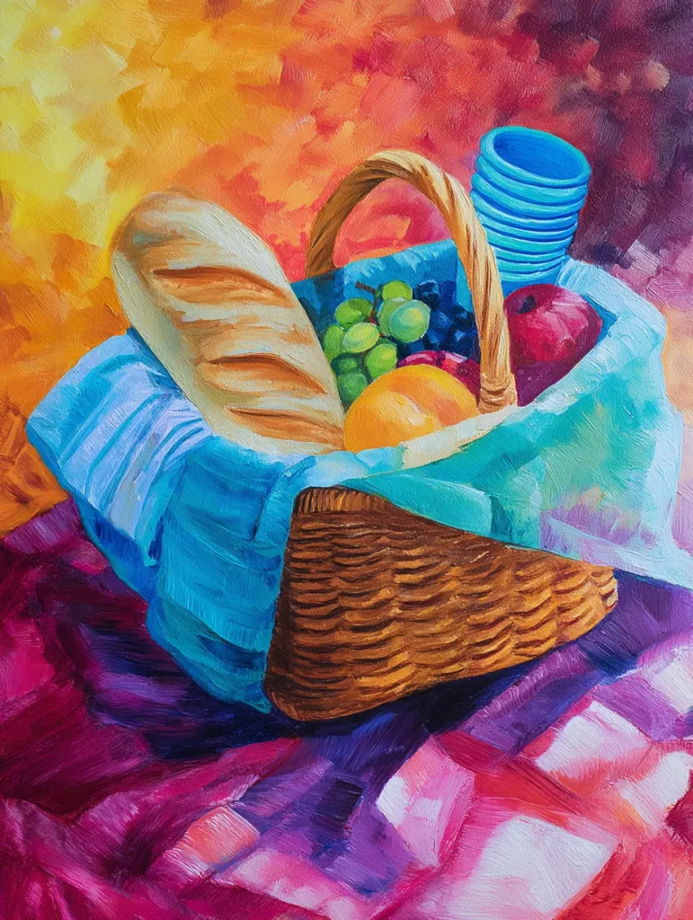 This charming painting has a classic woven picnic basket overflowing with fresh treats like a crusty loaf of bread, juicy grapes, and a shiny apple, all tucked into a bright blue cloth liner. A stack of light blue cups sits nearby, adding a pop of cheerful color against the rich purple checkered tablecloth and a warm, glowing yellow and orange background. To create this, start by painting the background with soft, blended colors to set the scene, then sketch your basket and the contents with simple, rounded shapes. Once you have the structure down, build up the texture of the woven basket using short, cross-hatching strokes of brown, and finish by adding highlights to the fruit and the cloth to give everything a light, inviting feel.