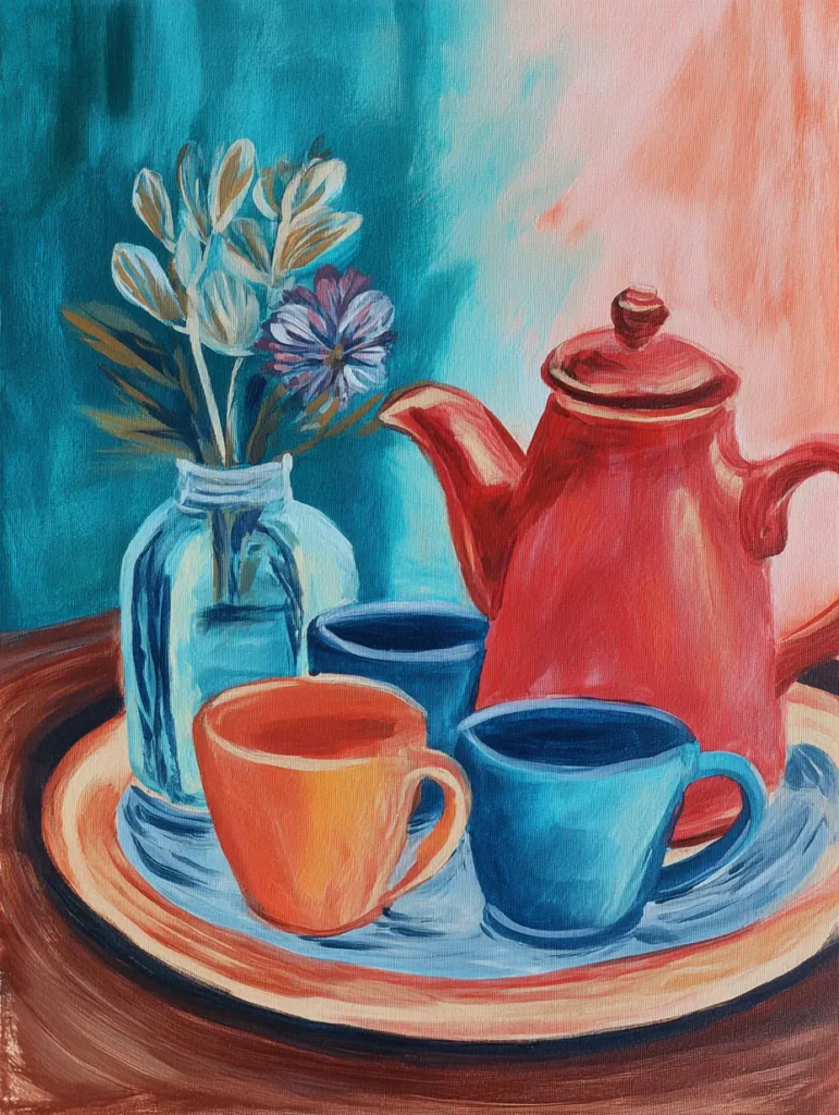 This inviting painting features a bright red teapot sitting alongside two colorful mugs, one orange and one blue, on a rustic wooden tray. A clear glass vase filled with delicate white and purple flowers stands beside the teapot, all set against a soft, split background of deep teal and a warm peach tone. To create this, start by painting your background using a large brush to blend the teal and peach sections, then sketch the basic shapes of the teapot, cups, and vase onto your canvas. Fill these in with solid base colors and use a smaller brush to add light, airy strokes for the flowers, finishing with subtle highlights on the ceramic surfaces to give them a nice, smooth shine.