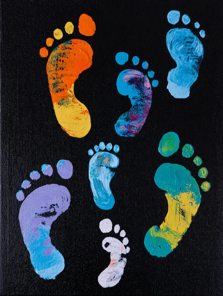 This cheerful and interactive painting shows a collection of colorful footprints in various sizes—ranging from bright orange and blue to soft purple and a tiny white print—all set against a stark, solid black background. The contrast between the vibrant, textured paint of the prints and the deep, dark backdrop makes each one pop, creating a fun, whimsical composition. To create this, start by painting your entire canvas black and letting it dry completely. Then, simply dip your own foot (or use a stamp) into different shades of acrylic paint and press them firmly onto the canvas, experimenting with different colors and sizes to create a unique family-style pattern. Once they dry, you can use a small brush to touch up any areas or add tiny highlights to give the prints a bit more depth and dimension.