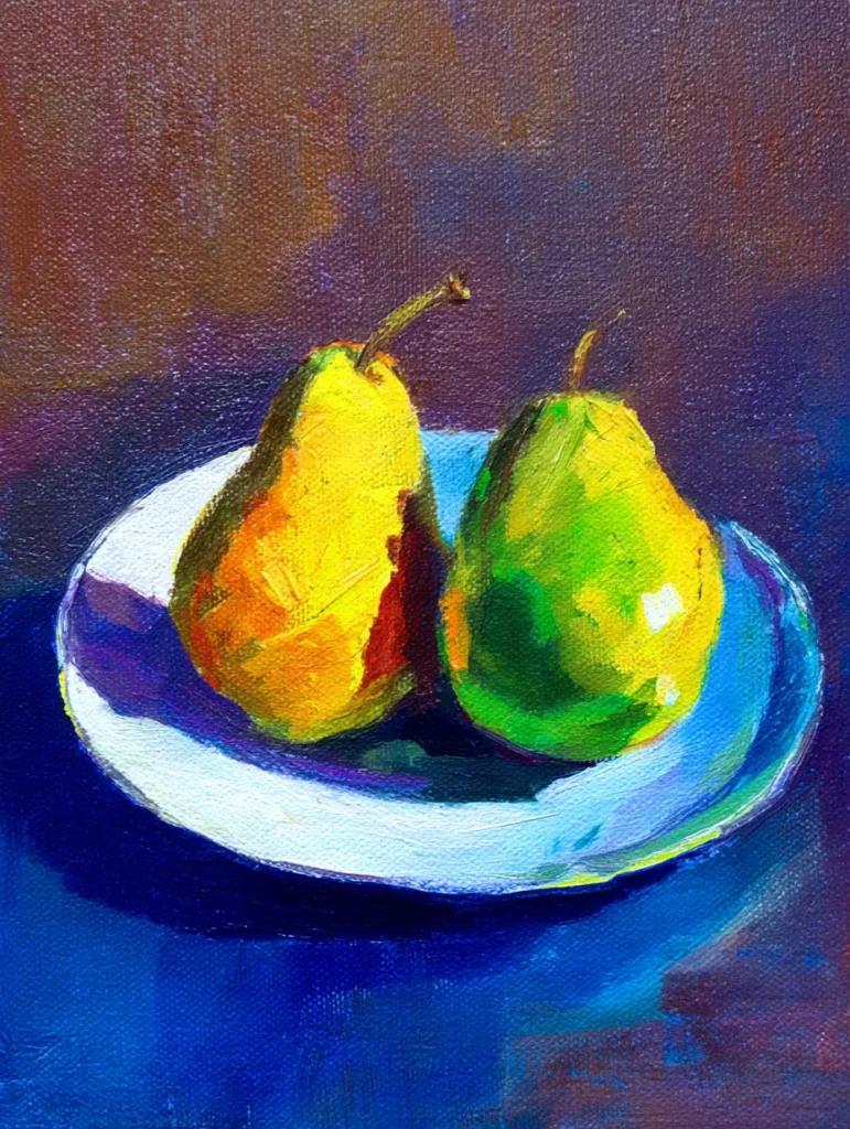 This painting captures two pears resting on a simple white plate, rendered with thick, visible brushstrokes and a rich color palette. The background features deep, moody tones of purple and brown, while the pears themselves pop with bright, contrasting shades of sunshine yellow and lime green. Strong, dramatic shadows cast in darker blues and purples help create a sense of depth and weight on the surface. To recreate this, begin by blocking out the main shapes of the fruit and the plate with dark, neutral colors to establish your light source. Once those forms are set, layer your brighter pigments over the top using a firm brush, focusing on keeping the strokes distinct and painterly rather than smoothing them out too much.