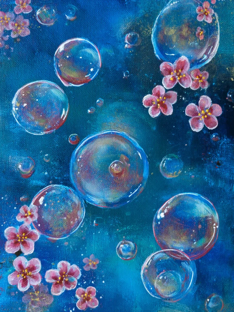 This enchanting painting captures the whimsical beauty of delicate pink cherry blossoms drifting among shimmering, translucent bubbles against a deep, moody blue background. The scene feels weightless and serene, as the transparency of the bubbles—achieved with soft gradients and tiny white light reflections—perfectly contrasts with the solid, textured petals of the flowers. To create this, start by painting your dark blue base, blending in subtle lighter blue tones to give the water a sense of depth. Once dry, paint your cherry blossoms using soft pinks and bright yellow centers. For the bubbles, paint soft, circular washes of color, then use a tiny detail brush to add those crisp white highlights along the curves to make them look like they are truly floating and catching the light.
