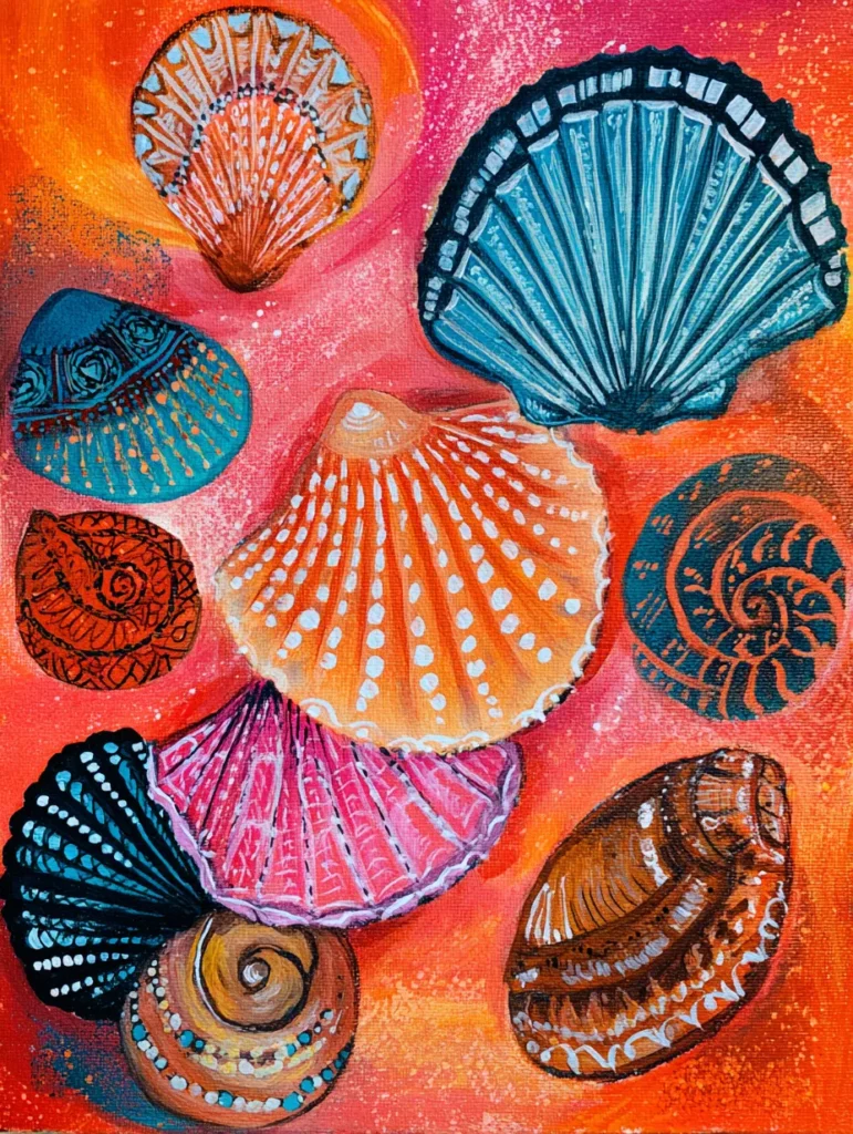 It’s super relaxing to work on this, with each shell acting like a small piece of the bigger picture. It is a fantastic way to practice your brush control and fine-line work without the pressure of needing perfect realism, as you can have so much fun inventing patterns for each one. If you want a project that brings a splash of warm, summer-inspired color into your space, this is such a rewarding and cheerful one to create.
