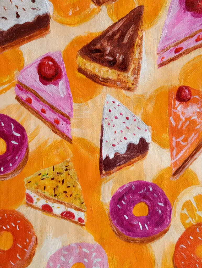 This delightful painting is a feast for the eyes, featuring an assortment of delicious treats scattered across a soft, warm orange and yellow background. The composition includes several triangular slices of cake with different toppings and a variety of colorful glazed donuts. To create this piece, start by painting the background with a soft, warm-toned wash. Once dry, sketch out the shapes of your various desserts, ensuring a good variety of sizes and angles to keep the composition dynamic. Fill in the base colors for each treat, then use a smaller brush to layer on details like the frosting, sprinkles, and fruit toppings. The key to making these look tasty is to add small, light-colored highlights on the rounded edges of the donuts and the tops of the cake slices, which give them a fresh, bakery-bought shine.