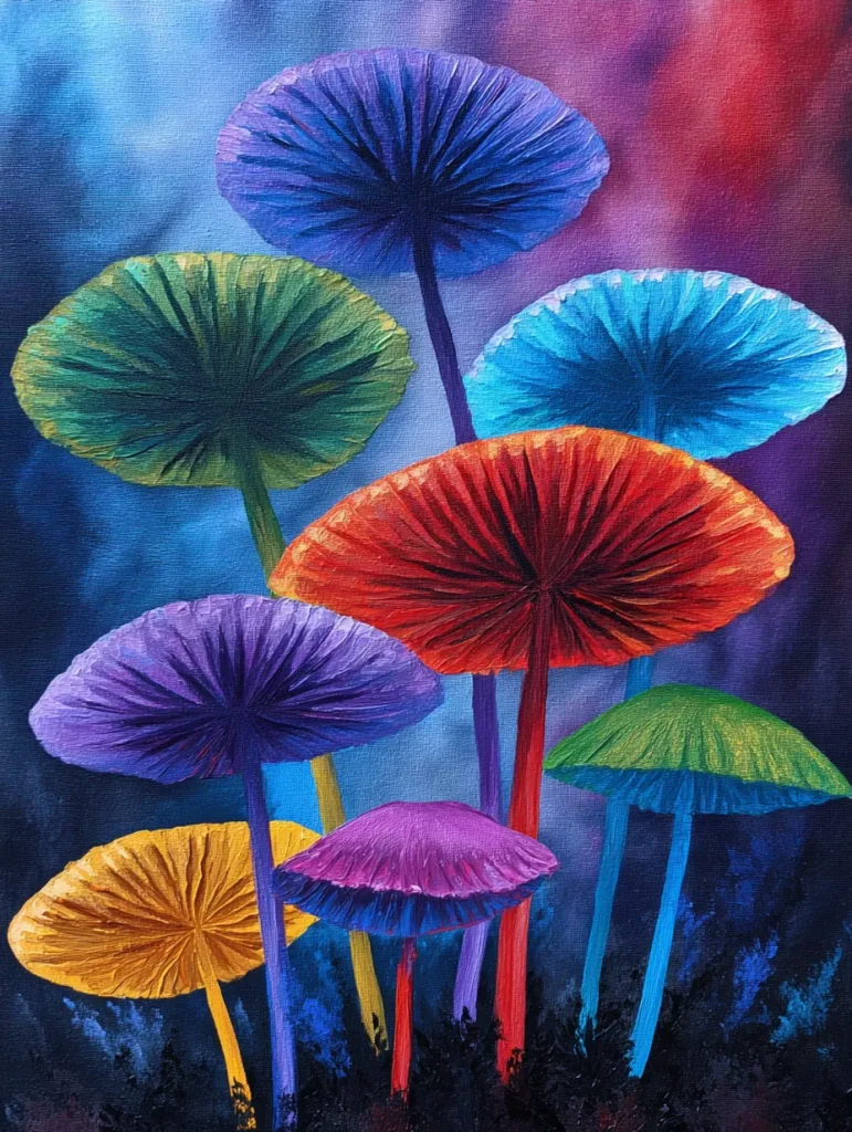 This imaginative piece features a cluster of stylized mushrooms with wide, pleated caps that radiate vibrant hues of electric blue, sunset orange, royal purple, and lime green. The stems are tall and slender, matching or contrasting the caps in a playful dance of color against a dark, moody background that blends deep indigo and magenta. Each cap is created with textured, directional brush strokes that move from the center point outward, giving them a rich, velvety depth. To bring this scene to life, start by painting a dark, soft gradient for your background. After that, map out your stem positions and paint the caps using a fan brush or a filbert to drag the paint outward from the center, creating those lovely, textured ridges that make these mushrooms pop.