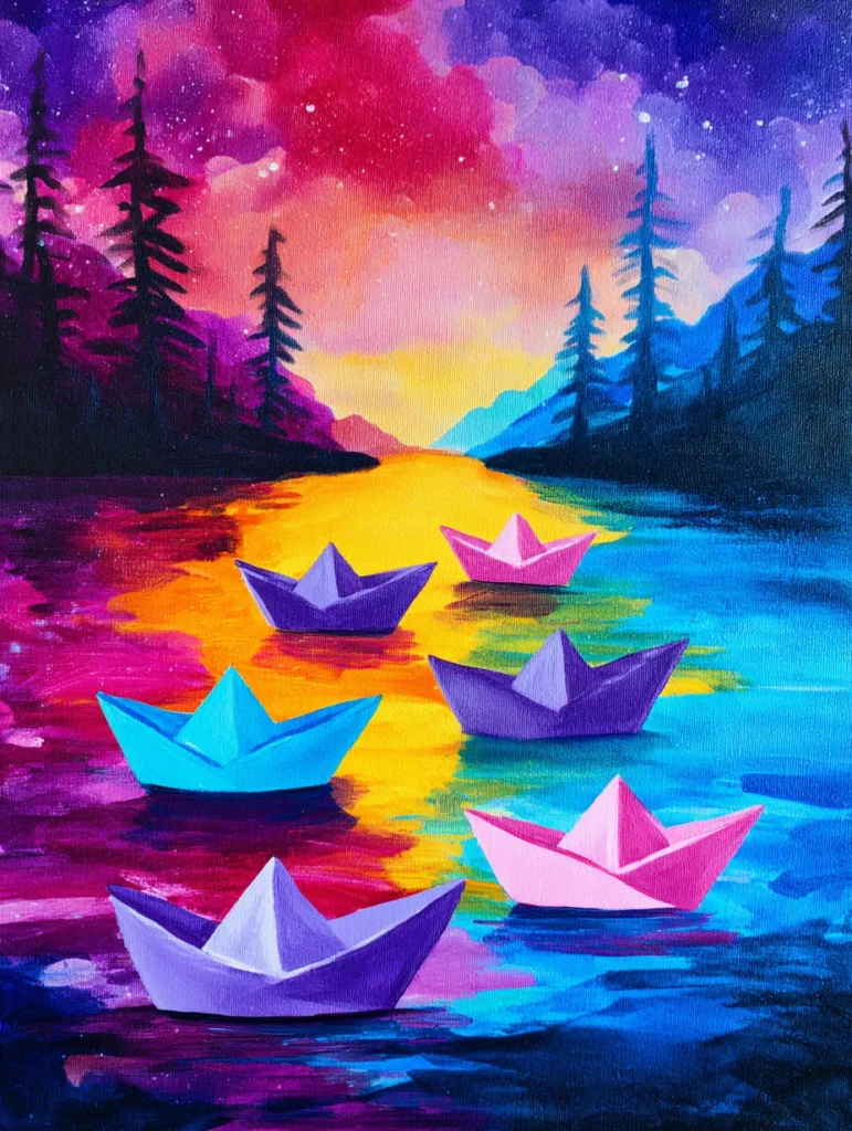 This dreamlike scene features a vibrant, glowing sunset sky reflecting over calm waters where several colorful paper boats float peacefully. The background is an explosion of purple, pink, and orange hues, while sharp, dark silhouettes of pine trees frame the edges to create a sense of depth. Each paper boat stands out in solid, bright colors like magenta, turquoise, and violet, contrasted against the warm, golden path of light hitting the water’s surface. Start your process by blending the sky and water gradients, keeping them soft and smooth. After the base is dry, use a small, flat brush to paint the geometric shapes of the paper boats, then add simple silhouettes of the trees in the distance to anchor the composition.