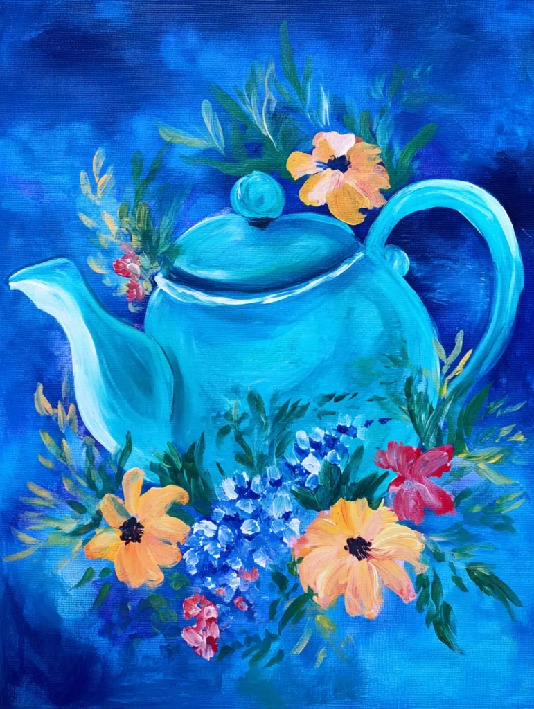 This enchanting painting centers on a bright turquoise teapot nestled within a lush, colorful arrangement of orange and red flowers, all set against a deep, moody blue background. The composition uses soft, blended tones for the teapot to give it a smooth, ceramic feel, while the surrounding florals are painted with quick, expressive strokes that add a lovely sense of texture and life. To create this piece, start by washing in your deep blue background, so you have a rich base to work with. Sketch the main shape of your teapot, fill it with your favorite shade of turquoise, and then layer on the blossoms using a smaller brush to build up those petals with light dabs of color.