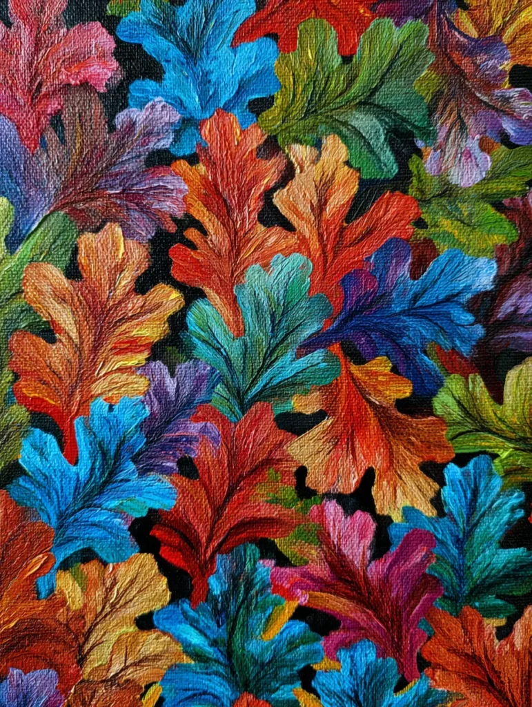 This vibrant painting features a dense, overlapping pattern of oak leaves in a stunning spectrum of saturated colors like electric blue, fiery orange, deep magenta, and mossy green. Every leaf is painted with prominent, textured brush strokes that follow the natural veins, creating a rich and tactile surface that stands out boldly against the deep black background. To recreate this, begin by painting your entire canvas black so the colors have a stark foundation to rest on. Use a small, firm brush to map out each leaf shape, applying your paint in thick, deliberate strokes that radiate from the center of each leaf outward to give them that lovely, organic movement.