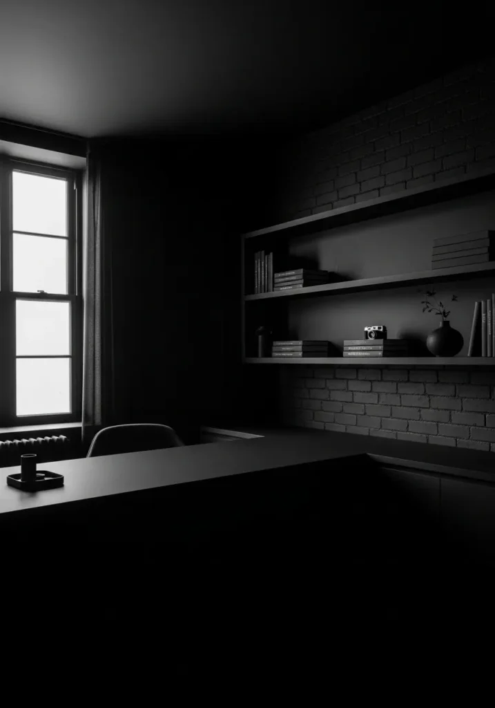 This dark office is layered in deep charcoal from the walls to the shelving, creating a dramatic cocoon effect. The desk sits centered in front of a bright window, which adds contrast and highlights the silhouette of the furniture. Built in bookcases fade into the background, enhancing the sleek and focused mood. The limited light makes every surface feel intentional and refined.