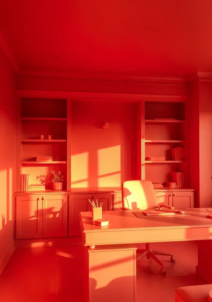 Fiery Red Color Drenched Office With Warm Sunset Glow
