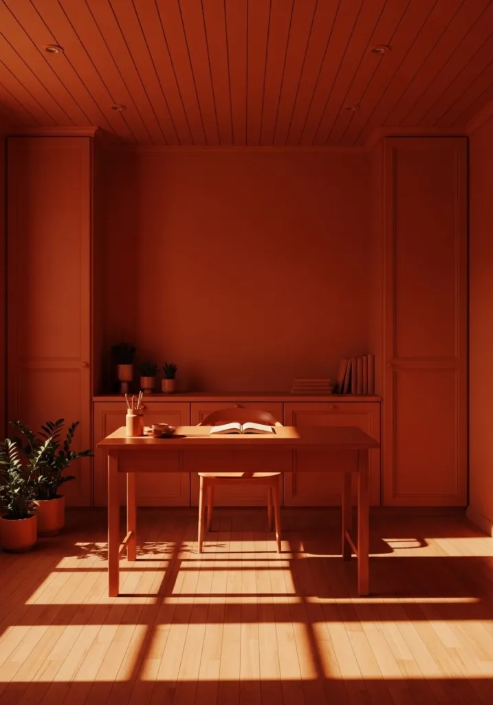 This office glows in a rich burnt orange that covers the walls, ceiling, and trim for a fully immersive look. Natural sunlight streams in and casts long shadows across the wooden floor, intensifying the warmth of the color. The simple wooden desk keeps the space grounded, while a few potted plants add softness against the bold backdrop. The slatted ceiling detail enhances the cozy and cohesive feel.