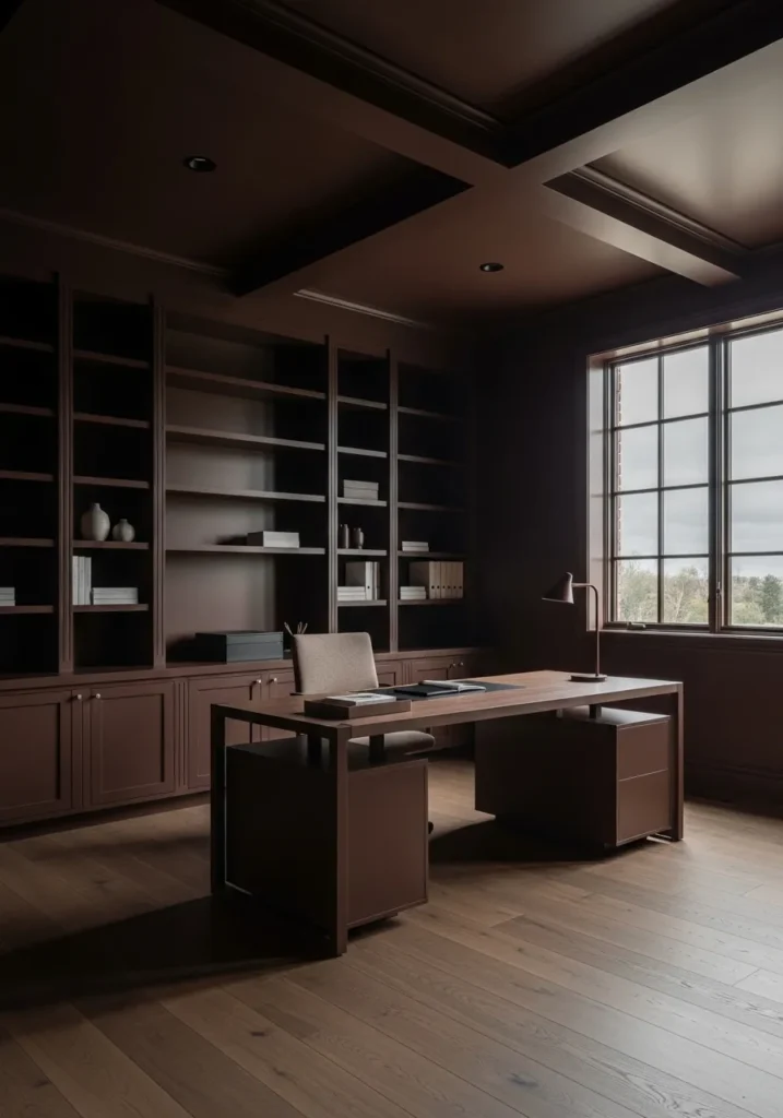 I find this design so captivating. The plum shade feels bold yet elegant, and it gives the room a timeless charm. It feels like the kind of space where big ideas are born. For anyone who loves a moody and statement making office, this color choice is absolutely stunning.