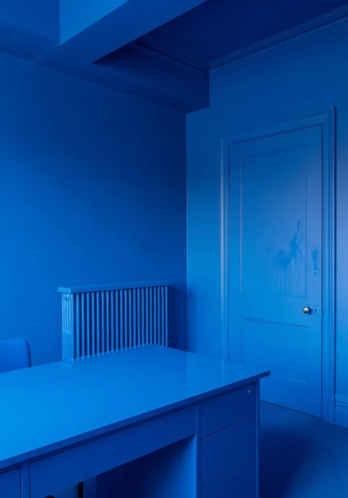 This space embraces a vivid blue that covers the walls, ceiling, trim, and desk for a fully saturated look. The single tone approach makes the room feel cohesive and bold. Architectural details like the door and radiator blend into the background, allowing the color to dominate in the best way. Soft natural light keeps the blue from feeling flat and adds subtle dimension.