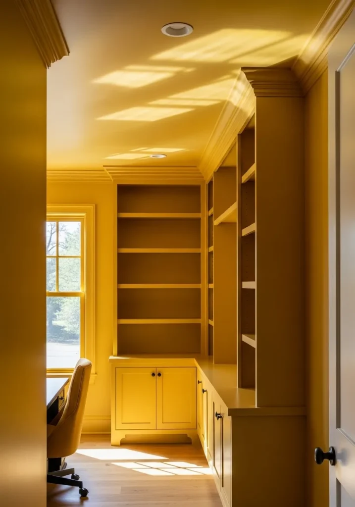 This office nook is drenched in a warm mustard tone that flows across the walls, shelving, and cabinetry. The built in shelves create a cozy and functional setup that feels custom and polished. Light filters in from the window and highlights the golden undertones, making the room glow softly. The simple desk chair and clean lines keep the look balanced.