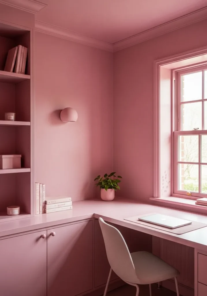 This soft pink office wraps the walls and built in desk in a gentle blush shade that feels calm and inviting. The color continues onto the shelving, creating a unified and harmonious look. Natural light from the window enhances the rosy tone and gives the room an airy feel. The simple white chair and minimal decor keep everything fresh and uncluttered.
