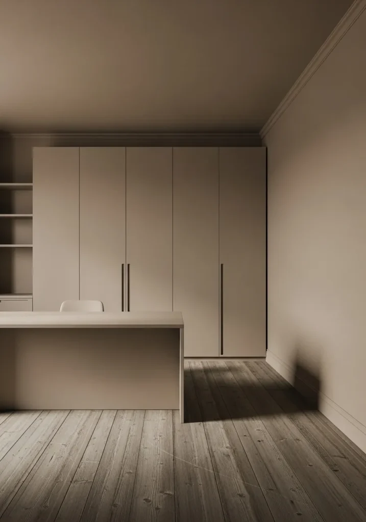 Soft Greige Minimalist Office With Seamless Cabinetry