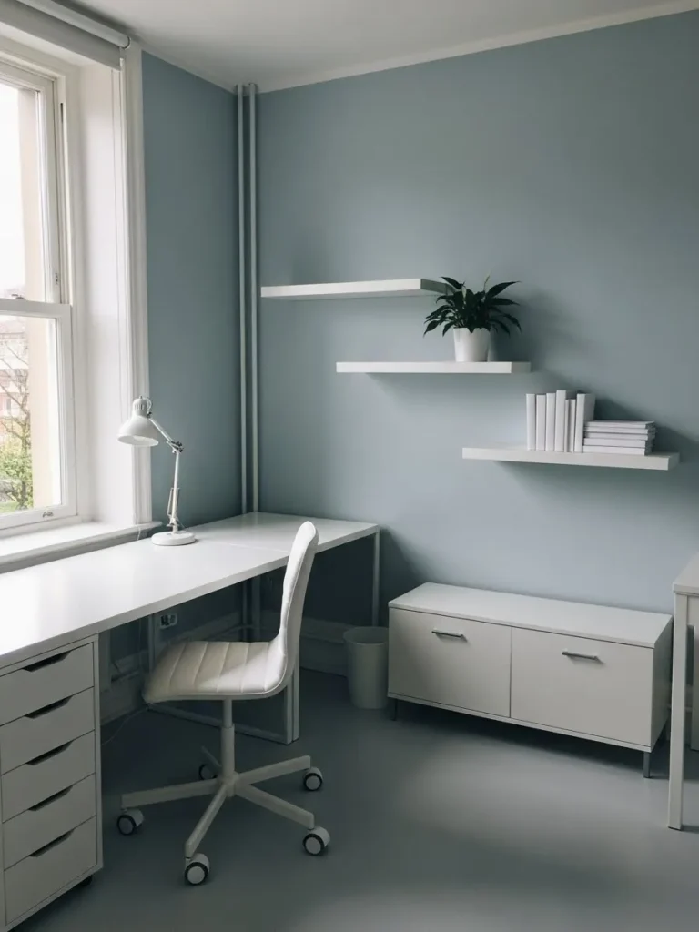 This home office feels calm and airy thanks to the soft blue gray walls paired with crisp white furniture. The color choice is gentle without feeling boring and it gives the whole space a fresh and slightly modern vibe. White desks and storage keep everything looking light and uncluttered while the simple floating shelves add function without visual noise. Natural light coming through the window makes the wall color feel even softer and the minimal styling keeps the room feeling open and easy to work in.