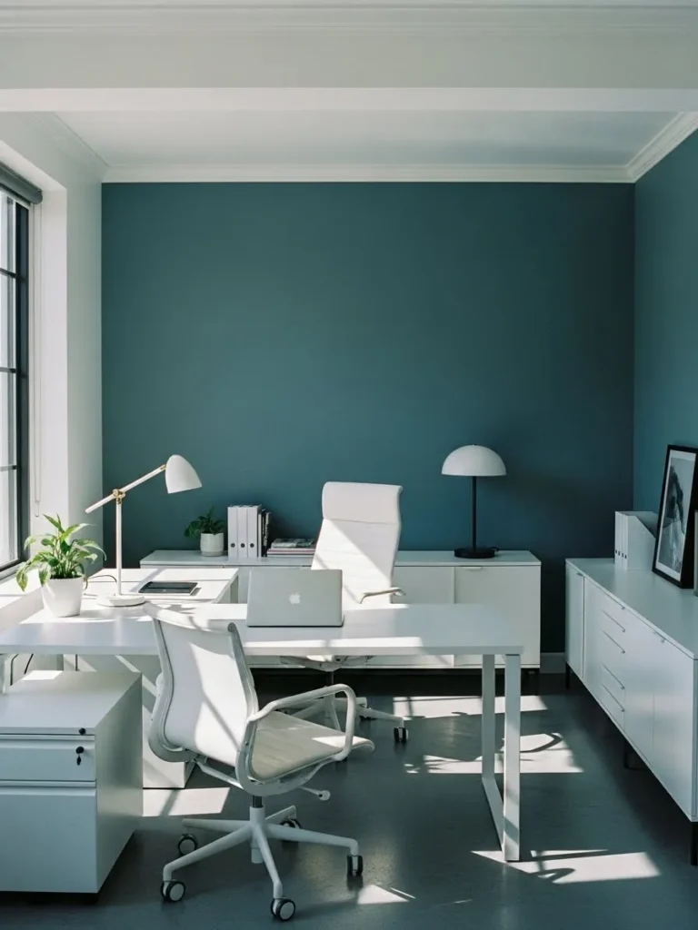 This office design pairs a rich deep teal wall with sleek white furniture for a look that feels calm but still confident. The bold wall color instantly grounds the space while the white desk, storage units, and chairs keep everything feeling light and organized. Clean lines, simple shapes, and minimal decor let the paint color do the heavy lifting without the room feeling dark. Natural light bouncing off the white surfaces softens the teal and makes the whole space feel fresh, modern, and easy to work in.