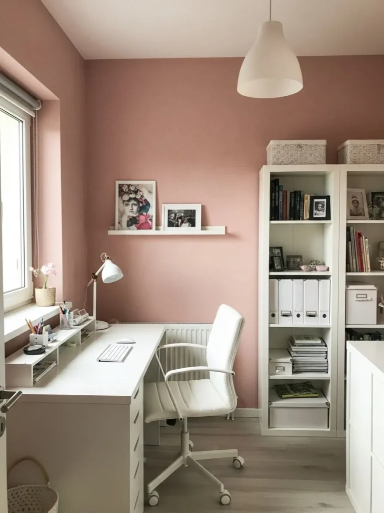 This home office pairs a soft blush pink wall color with crisp white furniture for a look that feels calm, cozy, and quietly stylish. The white desk and shelving keep everything light and uncluttered, while the muted pink walls add warmth without stealing attention. Natural light from the window softens the whole space and makes the color feel airy instead of sweet. Simple decor like framed art, neat storage boxes, and a comfy white chair keeps the room functional but still pretty enough to stare at between emails.