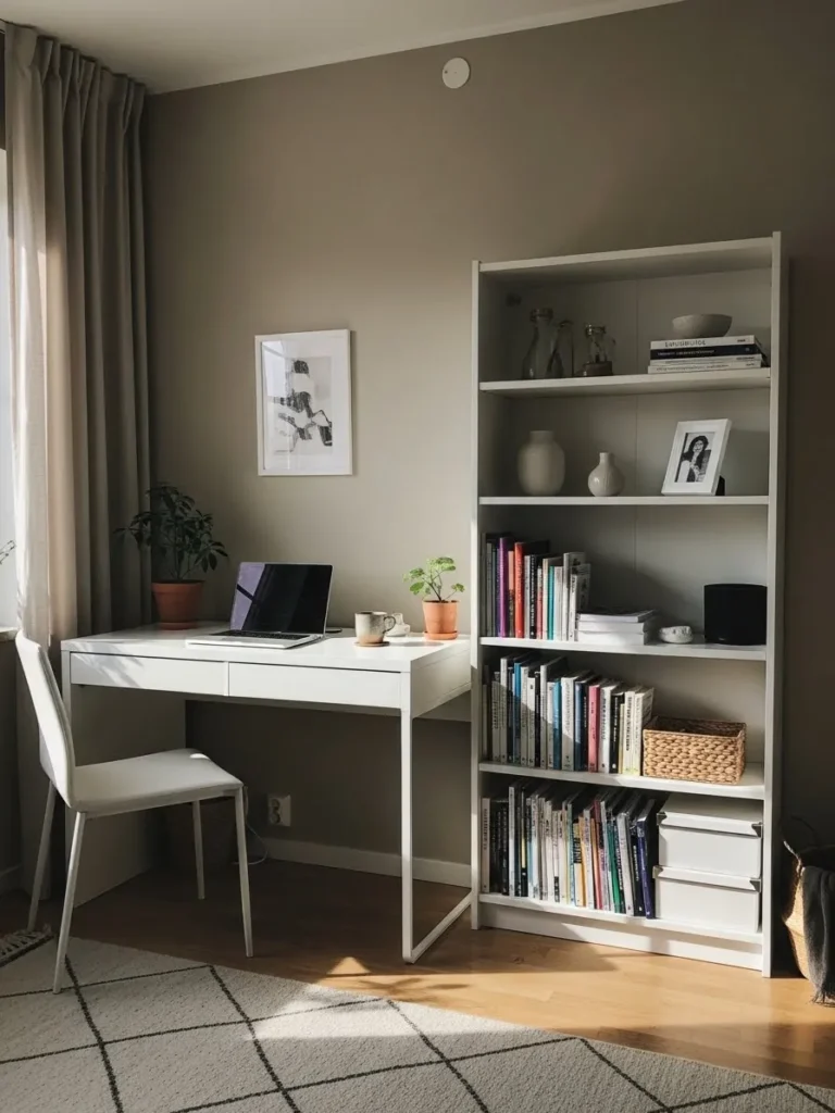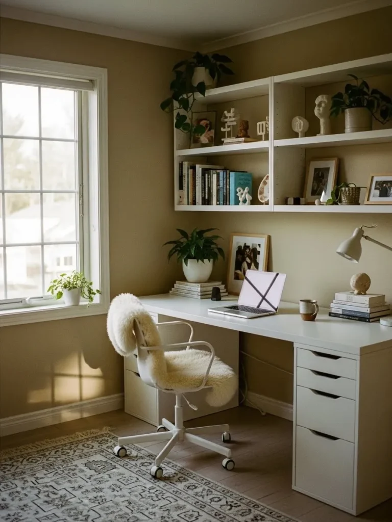 I honestly love how effortlessly peaceful this setup feels. I can picture sitting here with my coffee, laptop open, and my brain actually cooperating for once. The muted wall color makes the white furniture look crisp instead of sterile, which is not always easy to pull off. It feels like the kind of office that helps you focus without feeling boring, and that is my favorite kind of productive space.