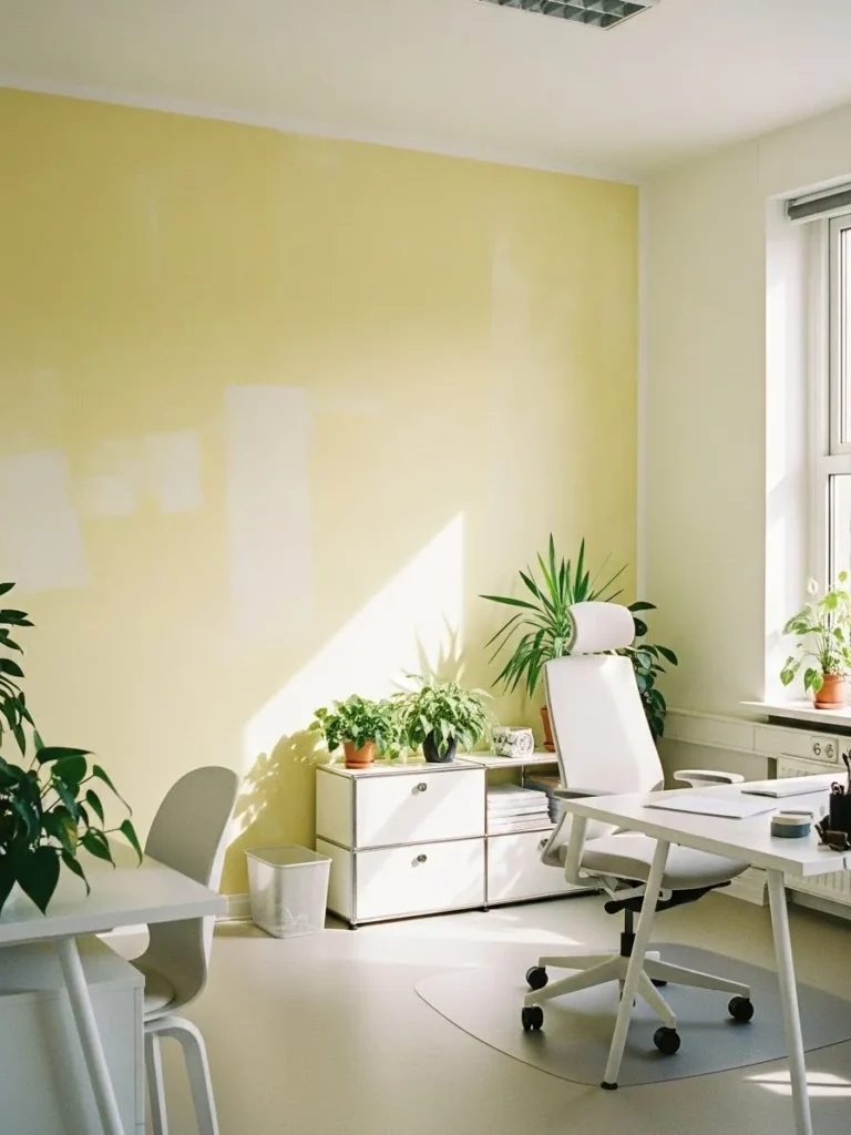 This home office pairs a soft butter yellow wall color with crisp white furniture for a space that feels bright, gentle, and quietly uplifting. The warm yellow backdrop reflects natural light beautifully, especially with the sunlight streaming through the window and bouncing off the white desk, chair, and storage units. Clean lines keep everything feeling fresh and uncluttered, while leafy green plants add just the right amount of life and contrast. It is minimal without feeling cold, and cheerful without being loud, which is such a sweet balance for a work space.