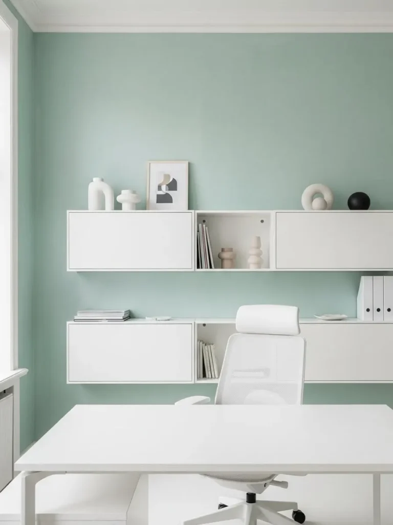 Soft Sage Green Office With Crisp White Storage