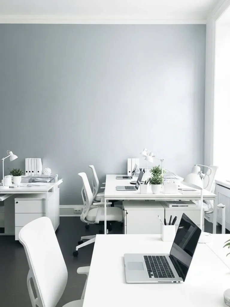 This office design keeps things calm and polished with soft gray walls paired beautifully with crisp white furniture. The light gray paint has a cool and airy feel that makes the space look larger and more open, while the white desks and chairs keep everything feeling fresh and uncluttered. Natural light floods the room and bounces gently off the pale surfaces, creating a bright workspace that feels modern without being stark. The simple decor, minimal accessories, and clean lines give the whole room a balanced and organized look that feels easy to work in all day.